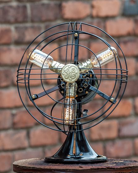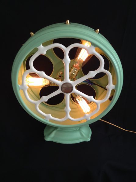 Mid-century fans are stripped, primed and painted a variety of rich eye catching colors and re-purposed into lamps. They are fitted with a solid brass socket cluster and 3 or 4 brass bulb sockets. Depending on the size of the fan the lights used are either 40 watt Edison bulbs (2500-3000 hour life) or 7.5…Repurposed Antique Speakers