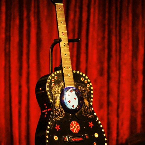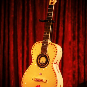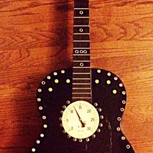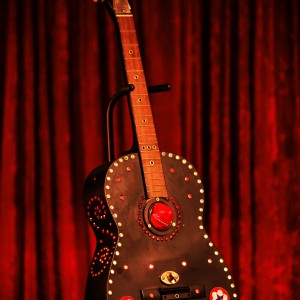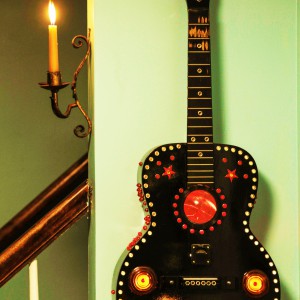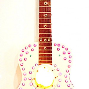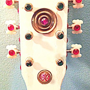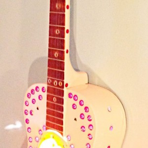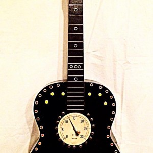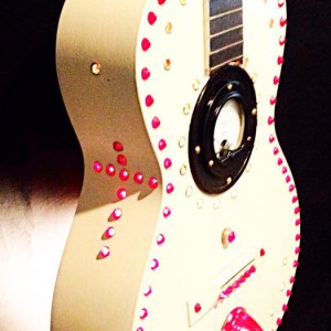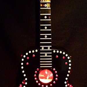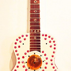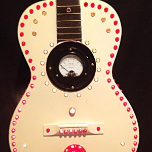 These are full size real guitars re-purposed into art pieces. All are fitted with a single light bulb in the interior.They are painted and assembled with a variety of gauges, grommets. rhinestones, and an assortment of other interesting objects that will enhance the piece. Prices range between $275 and $425 depending on the piece.