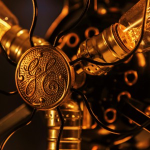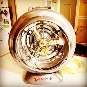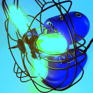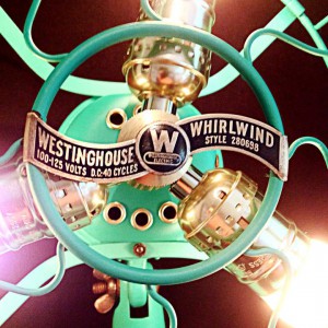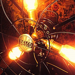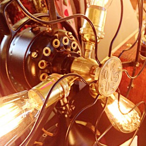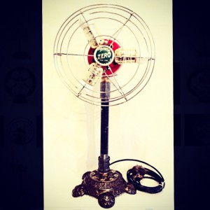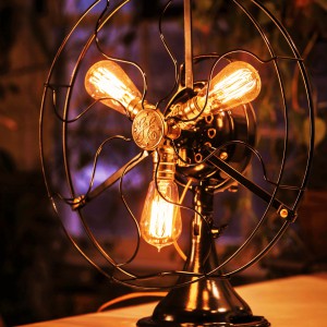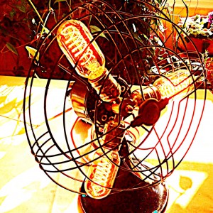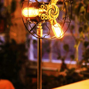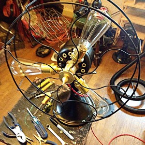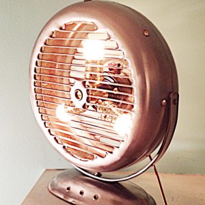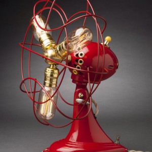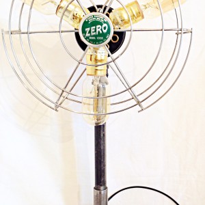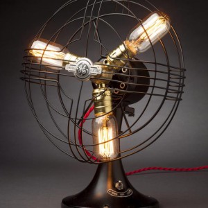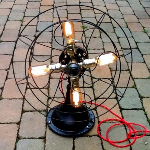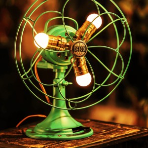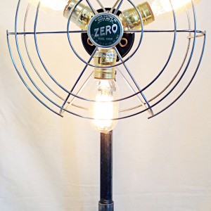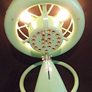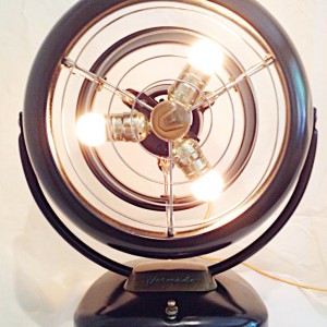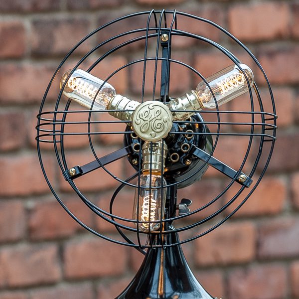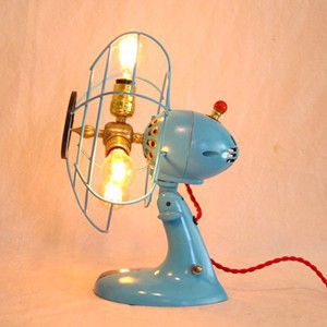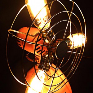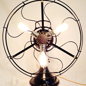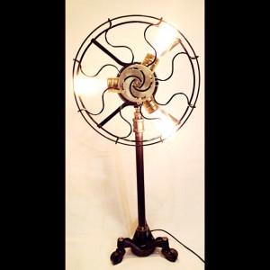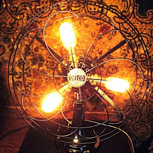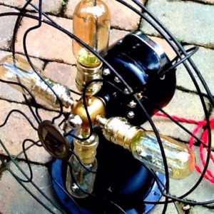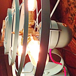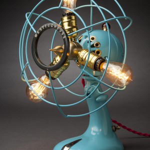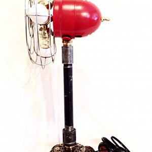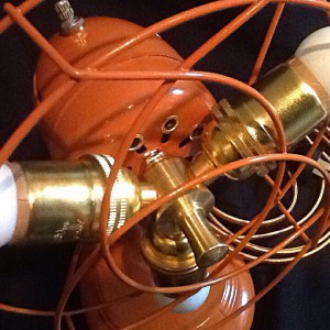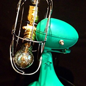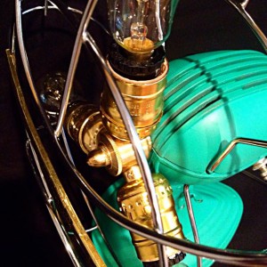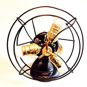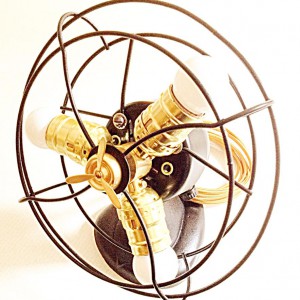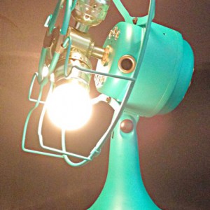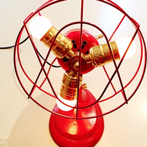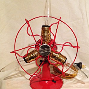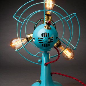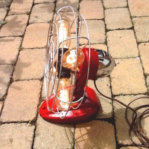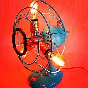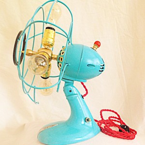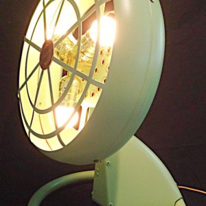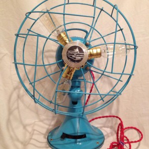Mid-century fans are stripped, primed and painted a variety of rich eye catching colors and re-purposed into lamps. They are fitted with a solid brass socket cluster and 3 or 4 brass bulb sockets. Depending on the size of the fan the lights used are either 40 watt Edison bulbs (2500-3000 hour life) or 7.5 watt frosted white bulbs.