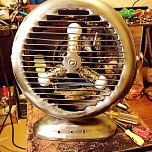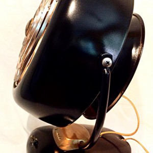 In addition, brass or bronze grommets are used to embellished the piece where ever possible. Any original brass parts are restored and kept on the piece as with original on/off toggle, rotary or slider switches. Dimmer switches are used on larger fans where possible. Power cords are either black plastic or braided cloth with retro style plugs depending on the piece. All are felted on the bottom as to protect any furniture they are placed on.