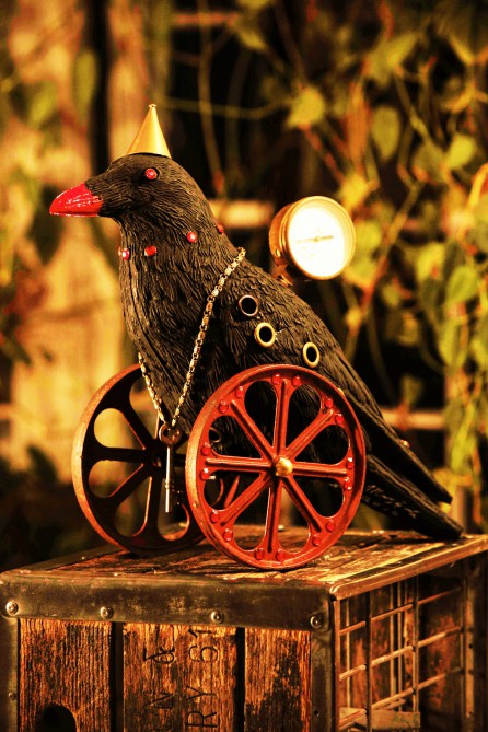 Assembled with a mix of metal parts, grommets, wheels and oil cans these form to make interesting and at times whimsical piece. Not recommend for small children. Prices start at $45