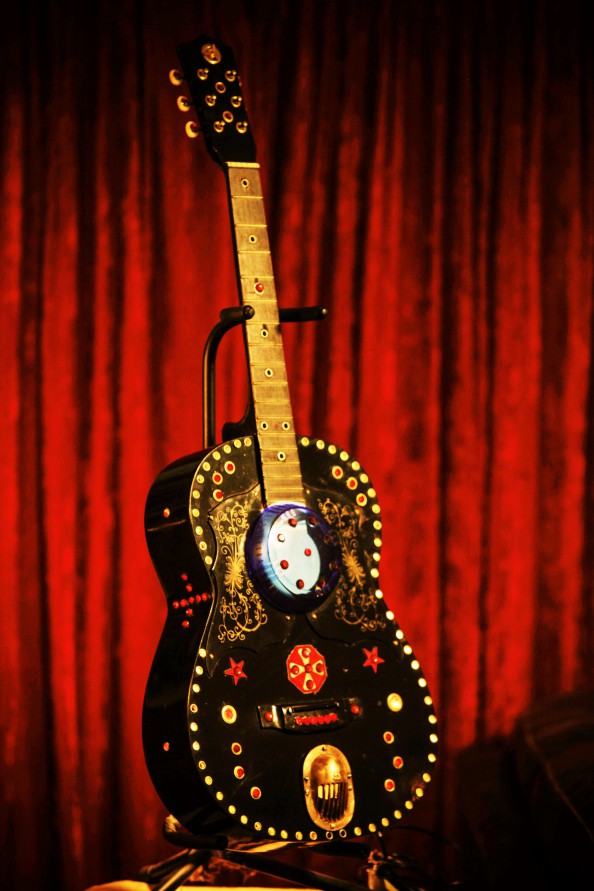 These are full size real guitars re-purposed into art pieces. All are fitted with a single light bulb in the interior.They are painted and assembled with a variety of gauges, grommets. rhinestones, and an assortment of other interesting objects that will enhance the piece.